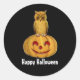 Uma imagem vintage de uma coruja sentada em uma abóbora sorridente é apresentada neste adesivo redondo. Com a mensagem "Feliz Halloween", é uma ótima decoração para usar em cartões, álbuns de recortes, doces ou travessuras e mais!