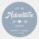 Um adesivo azul empoeirado personalizado para sua correspondência de casamento e favoritos para festas com "Let The Adventure Begin" escrito em uma mistura de tipografia branca simples e um roteiro branco retrô, um coração com uma seta, e seus nomes e data de casamento.