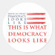 Este adesivo pede, "Mostre-me como é a democracia!" Nós respondemos, "É assim que a democracia se parece!" Está disponível em várias formas e tamanhos.