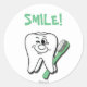 Um adesivo bonito com dente de desenho animado segurando uma escova de dente verde sobre fundo branco.