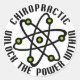 Este design apresenta um átomo com texto que diz CHIROPRACTIC: DESBLOQUEIE A ENERGIA DENTRO.