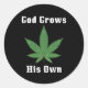 Este adesivo engraçado "Deus Cultiva Seu Próprio" apresenta uma grande folha verde de erva daninha sobre um fundo preto com texto branco que diz, "Deus Cultiva Seu Próprio." E ele tem.