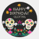 Dia dos adesivos de aniversário felizes mortos que você pode personalizar com seu nome. Feliz Aniversário é marcado em ossos e o design inclui crânios florais de açúcar, couros e flores de fiesta. Procure na minha coleção do Dia de los Muertos estilos de alternativo e itens correspondentes.