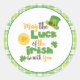 Este adesivo festivo de férias apresenta a imagem do texto "Que a sorte dos irlandeses esteja convosco", com o chapéu, a moeda e os pincéis irlandeses em fundo de xadrez verde. Perfeito para o seu Dia de São Patrício!
