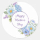 Um adesivo grande e redondo de Dia de as mães feliz é mostrado com um adorável impressão floral azul e roxo. Personalizar ou comprar como está. Impressão de ações freepik.com