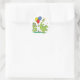Quinto aniversário, um dinossauro verde-giro-brontosauro com chapéu de festa e balões, vulcão ao fundo, com texto que diz: "Tenho 5 em verde.