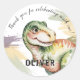 Each sticker includes a curved “Thank you for celebrating with me!” message and your child’s name printed below the dinosaur, making them perfect for sealing favor bags, decorating party treats, or labeling thank-you gifts. The clean circular layout keeps text clear and easy to read.