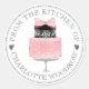 Lindo bolo de camadas rosa em aquarela com "do kitchen de" , etiquetas redondas para produtos de panificação, com tipografia aberta decorativa clássica. Basta adicionar o seu nome. Um estilo atraente para seus produtos de panificação. Você pode usar a ferramenta de design simples para alterar o estilo e a cor das fontes.
