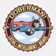 Logotipo do super herói de desenho "Doberman!", com Doberman voando e "Doberman - Loyal, Intelligent, Brave" em um emblema redondo. Divertido, engraçado, t-shirts, cartas, presentes.