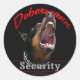 Dobermann Pinscher preto ameaçador com o texto "Segurança Dobermann" num autocolante. Coloque-os no seu carro ou itens pessoais para manter pessoas longe!