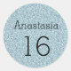 Um adesivo giro 16 com brilho azul-claro brilha brilha fundo cintilante prateado e escrevendo preto. Você pode personalizá-lo com seu nome e mudar o número para a idade do aniversário. Você pode até alterar a cor do texto e o estilo da fonte usando a opção personalizar.