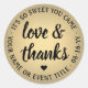 Adicione um toque personalizado às lembrancinhas e bilhetes de agradecimento com adesivos redondos / selos de envelope personalizados "amor e agradecimento". Toda a redação neste modelo é simples de personalizar para qualquer ocasião, como casamento, chá de noiva, formatura, festa de aniversário, aniversário de casamento ou aposentadoria. O design de folha falsa em preto e dourado apresenta caligrafia moderna no centro e tipografia elegante com o nome do evento e data em um círculo. Por favor, observe que o dourado é a cor impressa, não folha metálica. Como opção, altere o texto curvo para um nome e endereço para criar etiquetas de endereço de devolução redondas. Estas etiquetas elegantes adicionam um toque exclusivo e personalizado à celebração de um dia especial.