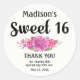 Muito bonito, doce 16 adesivo para selar favoritos para festas, envelopes de convite ou notas de agradecimento. Um sotaque floral cor-de-rosa é colocado no centro do obrigado que você cola. O nome da garota e Sweet 16 estão escritos acima. Obrigado para compartilhar este dia especial comigo e sua data de aniversário estão escritas abaixo.