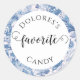 Uma festa personalizada de adereços em um adorável padrão azul francês, este design celebra um aniversário ou outra ocasião no estilo elegante! Apresenta o doce favorito do convidado de honra em uma mensagem especial no adesivo, incluindo o nome. Encontre várias maneiras de usar este adesivo para prestar homenagem ao convidado de honra no seu evento.