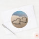 Lindos adesivos e selos de envelope com uma foto original de dois corações escritos na areia ao longo da água azul do oceano para significar amor e romance. Conceito de excelente para os próximos casamentos de verão.