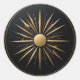 Um design elegante adesivo redondo com uma explosão geométrica do sol em linhas de ouro finas sobre fundo preto mate. Ideal para diários, etiquetas de presentes ou embalagens de temas cósmicos.