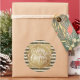 Feliz Natal em letras brancas chicas sobre um pedaço de ouro sobre um fundo de negros e pontos de ouro modernos sobre listras negras e brancas. Os adesivos vêm em 2 tamanhos e várias formas. CORRESPONDENTE a itens na nossa coleção.