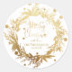 Aqui está uma escolha encantadora para rotular seus presentes de Natal, guloseimas, envelopes ou qualquer outro lugar que você queira enviar saudações nesta época de Natal. Esta design apresenta uma coroa maravilhosa de prigos, folhas e folhagem de eucalipto com bagas em folha de ouro falso. Dentro da coroa são as palavras "Feliz Natal" em uma caligrafia em dourado falso. Abaixo, aparece seu texto personalizável com sua família ou nomes individuais. Ao fundo está um brilho dourado criando a sensação de uma queda de neve com brilho. Tudo isso num fundo branco elegante. Se você tiver uma pergunta sobre design ou quiser ver este design em outro produto, por favor, sinta-se à vontade para entrar em contato comigo em jschmidtdesignworks@gmail.com. Design © Judith Schmidt.