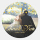 FOTO PERSONALIZADA DOURADA SCRIPT E OUROS CORAÇÕES CONFETTI OBRIGADO AO ROUND STICKER. Personalize com sua própria foto e nomes. Apresentando um elegante guião de ouro Obrigado e corações ouros confetti. Projetado por Piglet © Pura em www.zazzle.com/purepiglet*.