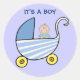 É um Chá de Nascimento de Bebê-Bebê. Adorável carrinho de bebê listrado azul com rodas amarelas, com um bebê giro a sair. Tudo em uma etiqueta azul de adesivo redondo. Use para anúncios, chás, rascunho ou na frente dos envelopes. O adesivo rosa também está disponível.