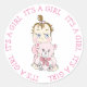 Bela menina morena segurando um ursinho. Chá de fraldas rosa "É uma menina" ou adesivos de anúncio de nascimento.