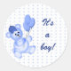 Urso azul bonito com seu boné segurando balões azuis. O texto é personalizável para outras ocasiões.