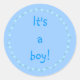 Um fundo azul com um círculo de bolinhas, com, é um menino, é impresso em adesivos. Divertido modo de anunciar o bebê e os chás de fraldas.