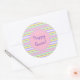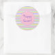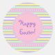 Adesivo redondo com uma imagem de listras púrpura, lavanda, verdes, amarelas e brancas pastéis com listras cor-de-rosa intercaladas com ovos de Páscoa sólidos e listrados, e um círculo cor-de-rosa com uma borda de travamento periférica e sentimento de feriado personalizável. Consulte confetti, etiqueta e papel de embalagem correspondentes. Ver toda a coleção de Páscoas Sticker na categoria CARDS & STICKERS na seção HOLIDAYS.