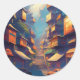 Essas etiquetas apresentam um design de arte surreal com cores vibrantes, mostrando prédios empilhados e casas em estilo caprichoso e imaginativo. Perfeito para capturar o encanto da arquitetura do sonho