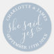 Este na moda azul empoeirado "ela disse sim" adesivo de festa de noivado pode ser personalizado com seus detalhes de festa de noivado. Projetado por Thisnotme©
