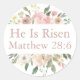 Um elegante buquê floral de cor-de-água, penteados cor-de-rosa pincelados e rosas de marfim enquadra estes adoráveis adesivos de Páscoa religiosa. Ele é Risen está escrito em lindo cor-de-pêssego para o verso bíblia Matthew 28:6. Bonito adesivo para uma reunião de igreja ou festa de Páscoa.