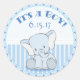 Um lindo elefante bebê sentado à sombra de faixas azuis de fundo. A data está em azul marinho e é personalizável. Esta é uma ilustração digital.