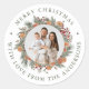 Share warm holiday wishes with these elegant Christmas stickers featuring your photo framed by a watercolor wreath of pine branches, eucalyptus, berries, pinecones, and dried citrus slices. Encircling the wreath is a festive greeting and family name displayed in classic green serif lettering for a timeless, personalized touch. Perfect for sealing envelopes, decorating gifts, or adding a coordinated detail to holiday party favors, these stickers bring natural beauty and sophistication to your Christmas celebrations.