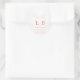 This elegant wedding sticker features a circular design with vertical beige and cream stripes as the background. The focal point is two bold, coral-colored letters "L" and "B," separated by a thin line, set above the phrase "THANK YOU" in matching coral serif font. Customizable for any date, this minimalist yet sophisticated sticker conveys gratitude and celebration, perfect for adding a personal touch to your wedding favors or thank-you notes. Its clean lines and warm color palette make it ideal for modern weddings seeking a refined aesthetic.