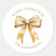 Elegant gold bow personalized Christmas classic round sticker. Easy to change the text. Festive design for the holiday season. Merry Christmas in gold text is at the top and the name is at the bottom.