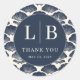 This Classic Round Sticker features a sophisticated nautical theme with a repeating pattern of stylized shells in deep navy blue on a cream background. The central circle highlights bold, capitalized initials "L" and "B," followed by the phrase "THANK YOU" in elegant serif typography, creating a formal and appreciative tone. The intricate detailing and balanced composition evoke timeless elegance, making it perfect for expressing gratitude at special events or as a thoughtful acknowledgment gift.