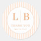 This Classic Round Sticker features a sophisticated design with vertical peachy-pink stripes and a central circle outlined in a delicate line. The initials "L" and "B" are prominently displayed in bold, serifed gold letters, accompanied by the phrase "THANK YOU" below in matching typography. The minimalist aesthetic emphasizes clarity and elegance, making it perfect for expressing gratitude at formal events or as a thoughtful acknowledgment. Its modern yet classic feel conveys appreciation and sophistication, ideal for personalizing gifts or event favors.