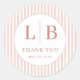 This Classic Round Sticker features a sophisticated design with vertical pink and white stripes framing a central circle. The bold, serif font displays the initials "L" and "B," separated by a thin line, while the phrase "THANK YOU" is elegantly centered below in smaller text. The soft pink and muted beige color palette creates a warm and inviting atmosphere, perfect for expressing gratitude at special occasions. Its minimalist layout and customizable date make it ideal for personalizing gifts or events.