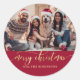Modern Elegant Script Red and Gold Family Photo Merry Christmas Script Holiday Classic Round Sticker. Features (one) photo template „Merry Christmas” text. The „Merry Christmas” greeting text is written in a beautiful hand lettered whimsical font script, family name, on red color background. At the top a cute family photo. Great for Mailing Accessories Envelope Seals and Gift Stickers for your family and friends in Christmas Holiday season.