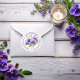 Elegante design nostálgico de selo de endereço de devolução de violetas roxas em aquarela em um fundo branco.