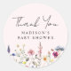 Obrigado floral elegante que você cola com adesivos que apresentam uma borda inferior de flores silvestres e folhagem de cor d'água em tons de rosa, amarelo, roxo, azul e verde em um fundo cor-de-rosa. Personalize o obrigado de chá de fraldas de flor silvestre que você cola com o nome da futura mãe. Os adesivos personalizados de flor silvestre são perfeitos para chás de fraldas de primavera e verão.