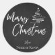 Elegante Script De Quadro De Chalkboard Merry Christmas Tree Classic Round Sticker. Personalize-o alterando os nomes. O design tem o Feliz Natal escrito em bonito fundo em um quadro, junto com os nomes do casal. Para mais personalizações, contacte-me em mypaperlove2021@gmail.com