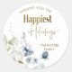Adesivo de Natal personalizado lindo, ideal como selo de envelope para seus cartões de Natal ou como etiqueta de embrulho de presente. Design com a frase "Wishing you the Happiest Holiday" em fólio dourado falso e detalhe requintado de folhagem de inverno em aquarela em tons de azul e verde. Elegante e simples. Possibilidade de alterar a frase para "Cheers to the Happiest Holidays". Parte da nossa coleção "Happiest Holidays Winter Greenery" com uma variedade de produtos coordenados disponíveis.