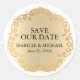 Belo medalhão de ouro claro está borrado em um ouro mais escuro. Ele é colocado sobre um fundo branco. O texto está escrito em um texto preto elegante. Salve nossa Data está escrita em letras maiúsculas. Seus nomes e casamentos estão escritos na mesma fonte, apenas menores. Maneira perfeita de selar a data envolvente.