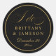 Um adesivo de casamento preto e dourado com "Eu faço" em caligrafia e sotaque de borda dourada editável. Personalize também a cor de fundo.