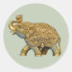 Um adesivo redondo com uma imagem de um elefante indiano ouro antigo com uma bola no seu porta-malas virado, adornada com tornozelos e um casaco e boné de flores e o símbolo de Om, a sílaba sagrada que é cantada em orações e mantras hindus e budistas. Ver vinheta de vinilo cortada por medida personalizada, etiqueta de favor, etiqueta e papel de embalagem. Veja toda a coleção do Inalador nos CONVITES | Seção Stickers & Labels