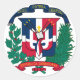 Casaco de armas da República Dominicana A casaco de braços da República Dominicana apresenta um escudo em cores igualmente quartejadas como a bandeira, apoiada por um galho da baía (esquerda) e um muro da palma (direita); acima do escudo, uma fita azul exibe o lema nacional: Dios, Patria, Libertad (Deus, Pátria, Liberdade). Abaixo do escudo, as palavras República Dominicana aparecem em uma fita vermelha. No centro do escudo, flanqueado por seis lanças (três de cada lado), as quatro dianteiras segurando bandeiras dominicanas, é uma Bíblia com uma pequena cruz ouro acima dela, que é aberta (de acordo com a crença popular) ao Evangelho de João, às 8:32, que lê Y la verdad os hará libre (e a verdade o fará livre). O casaco de armas aparece no centro da bandeira da República Dominicana.