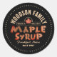 Este rótulo não é para os fracos de coração. Ousado, escuro e rústico, ele evoca a imagem de uma panela quente de seiva sendo fervida em uma velha estufa a lenha em um galpão. O emblema da folha de bordo laranja mostra a graduação enquanto o xarope de bordo é escrito em uma fonte decorativa rústica, e as fontes estão em um texto de cor âmbar pálido e cor de xarope de bordo. Edite este rótulo casual de xarope de bordo adicionando o nome da sua empresa, endereço, volume de xarope de bordo e graduação.