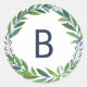 Adesivo monograma com uma coroa de folhas desenhada à mão em diferentes tons de verde e azul.