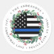 Adicione o toque final aos seus envelopes, cartões de Natal e papel de carta com esta única bandeira azul-fina da polícia, bandeira Natal Devolva Rótulo de Endereço - Feriado em uma bandeira da polícia, design design azul-preto moderno, com sombra e bagas. Personalize com o nome e endereço da família. Esta etiqueta de endereço de Natal da polícia é perfeita para policiais, polícias e família da polícia. COPYRIGHT © 2020 Judy Burrows, Black Dog Art - Todos Os Direitos Reservados. Polícia - Linha Azul Azul - Retorno de Natal - Clássico Autocolante